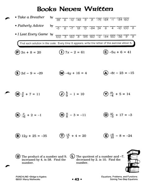 Some of the worksheets displayed are Marcy mathworks punchline bridge algebra answer key, Punchline algebra book b answers, Kindle file format punchline math, Bridge to algebra punchline two step equations, Equations and problems punchline algebra, Punchline math, Punchline bridge to algebra answer key equations, Punchline Showing top 8 worksheets in the category - Punchline Page 52. What is the answer to pg 99 punchline bridge to algebra? Asked by Wiki User. Showing top 8 worksheets in the category - Punchline Bridge To Algebra. You do your need to get free book access.